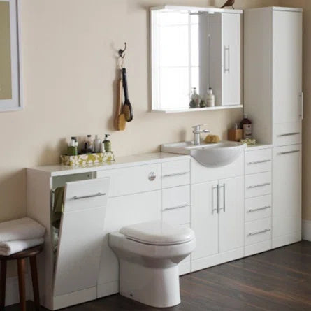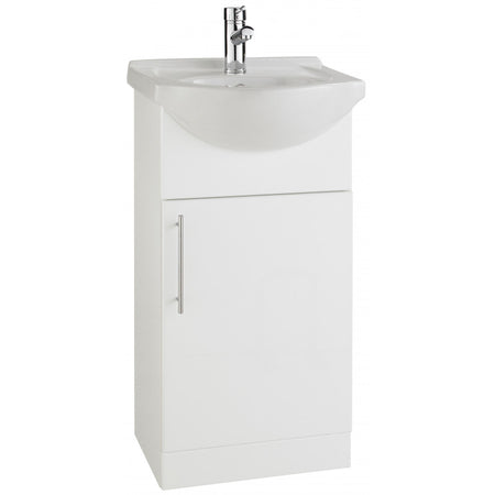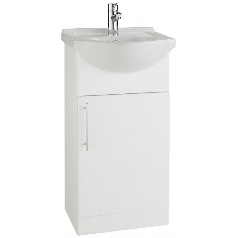 450mm Cabinet with Basin is a contemporary style, floor-standing vanity unit in a brilliant gloss white finish. Complete with a semi-recessed, one tap-hole. A perfect addition to any modern bathroom style, this vanity unit features a single door with stylish chrome handles providing a practical storage solution. The door features soft-close hinges for a luxurious closing.