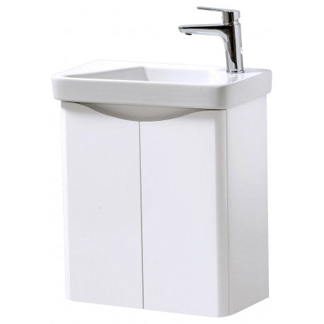Arezzo 500mm in White Gloss wall mounted 2 Door Cloakroom Unit & Basin offers a clean, modern, and minimalistic cloakroom unit to your bathroom with its White gloss finish and handleless doors that make it fit into any small spaced bathroom or cloakroom, no matter the design or decor. This vanity basin unit is a handleless 2-door model with a height of 600mm and a width of 500mm. It provides ample storage for any bathroom with its White gloss finish and design, making it a flexible and easy-fit choice for any modern cloakroom.