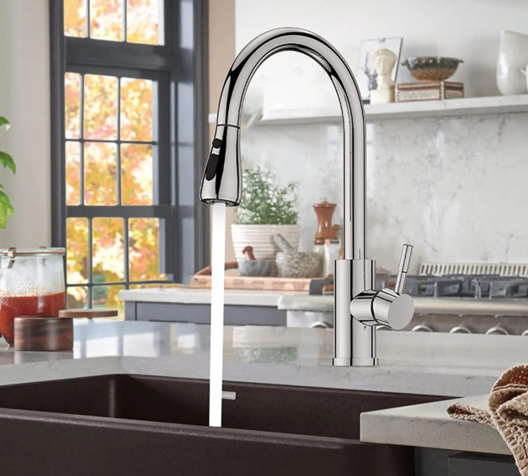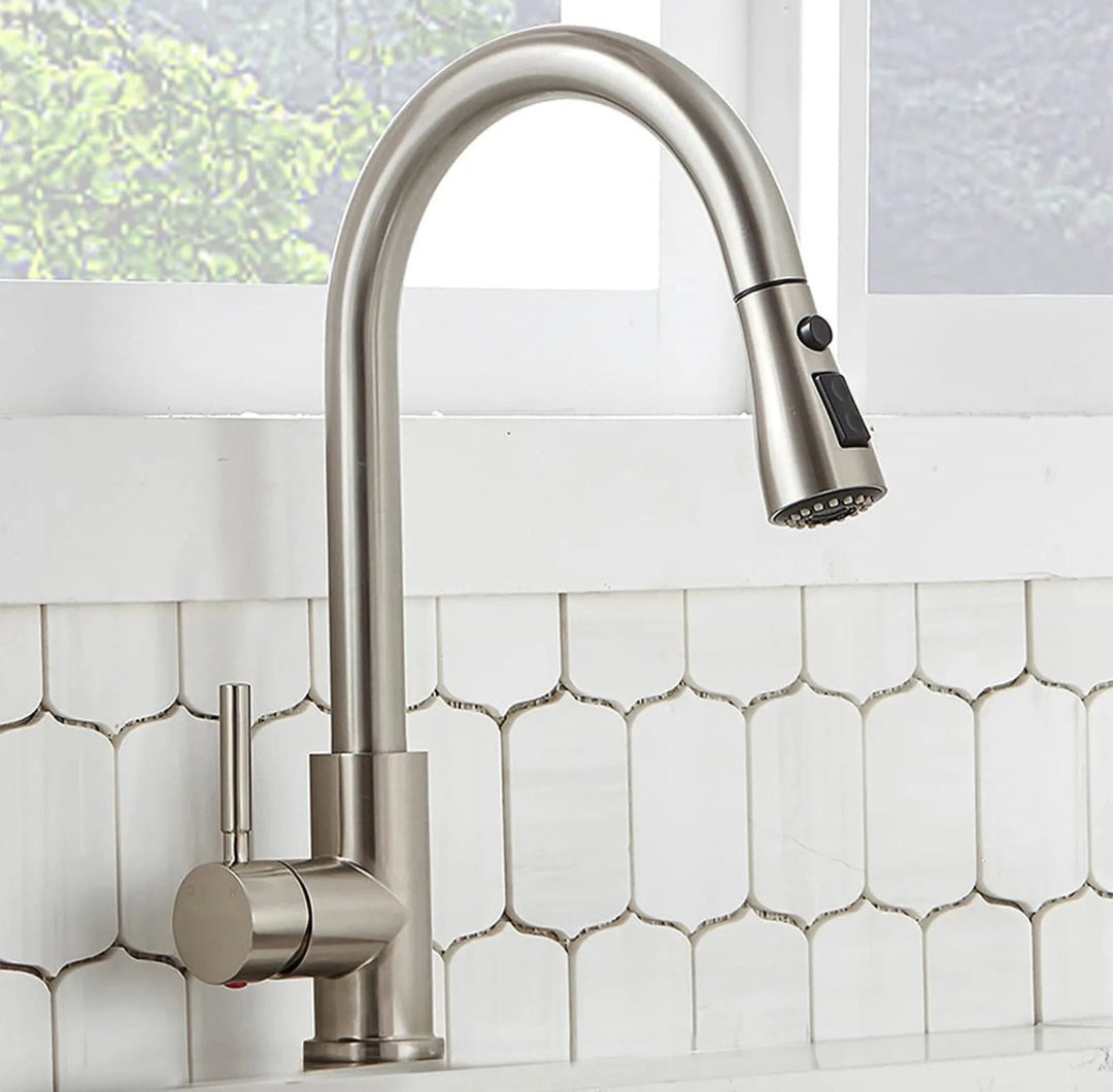 Contemporary, Luxury yet practical design this kitchen tap has a pull-down sprayer to make rinsing crockery and cutlery much easier.