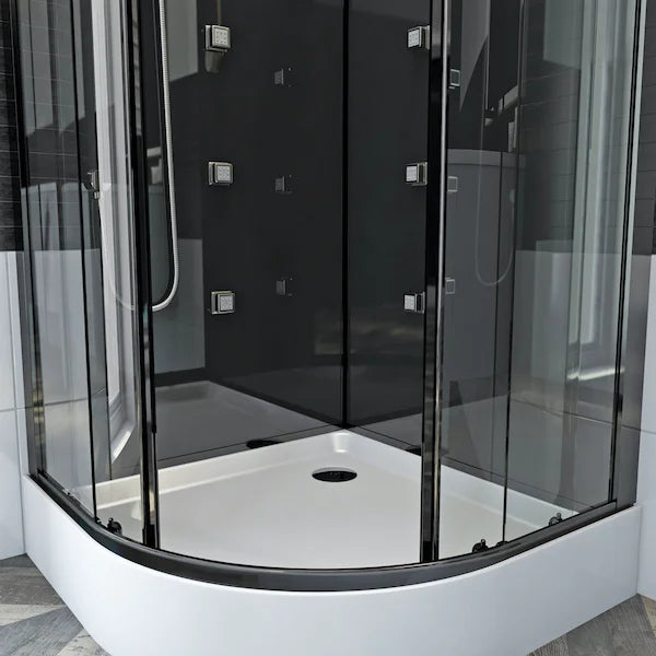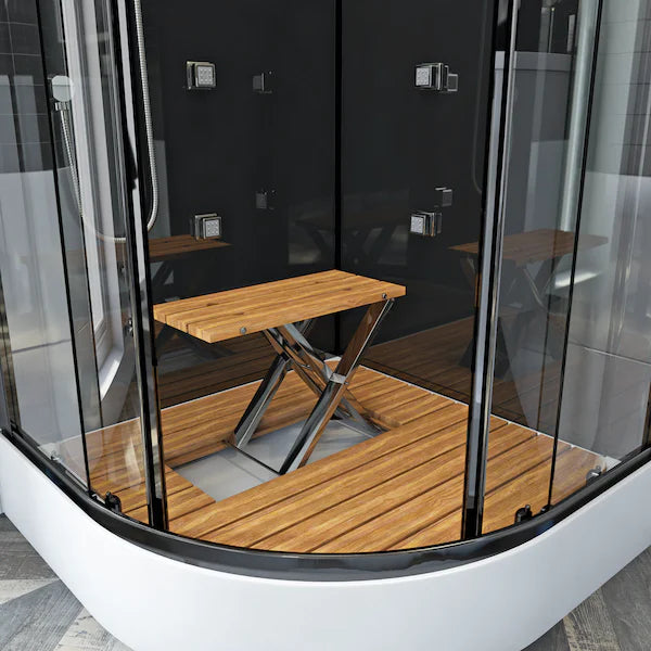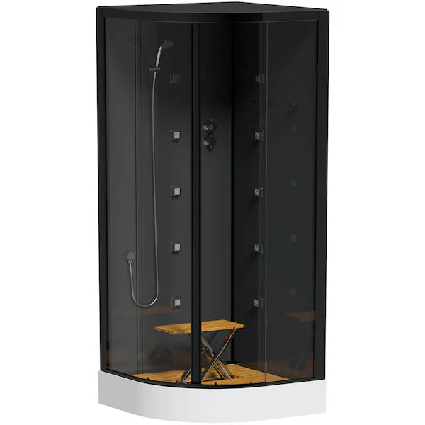 Quadrant black glass backed hydro massage shower cabin with wood effect floor and seat 900 x 900